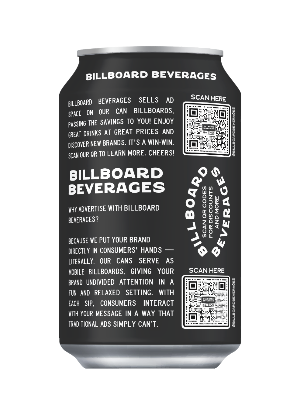 Billboard Beverages is more than just drinks. We sell ad space on our can billboards—passing the savings to you! Enjoy great drinks at great prices while discovering awesome new brands. It’s a win-win.